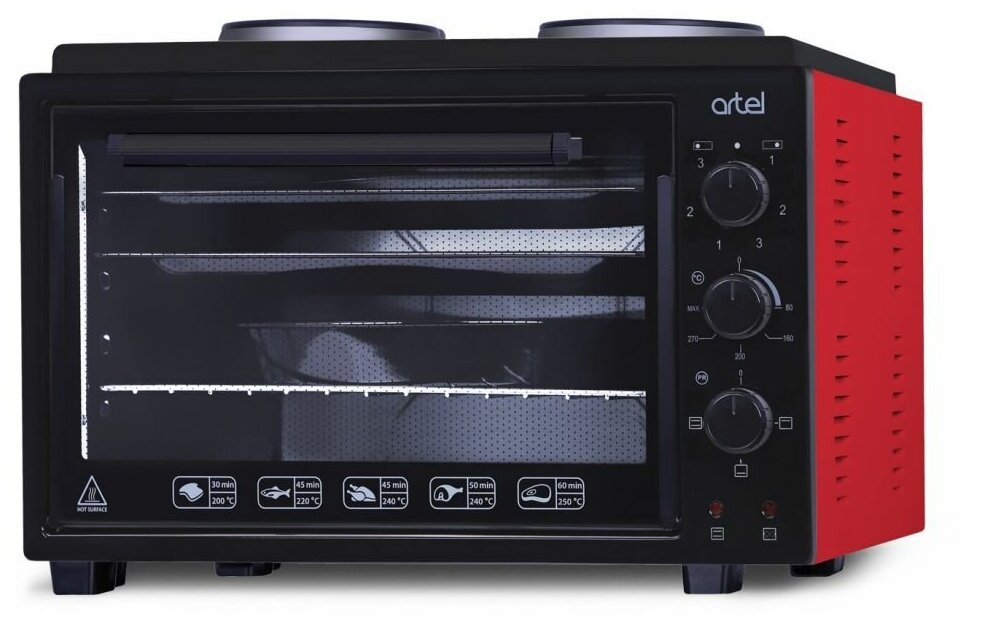 Мини печь ARTEL MD 3614 красно-черная, объем 36 л, 2 электроконфорки, 3 режима работы духовки, 2 противня, хромированная решетка