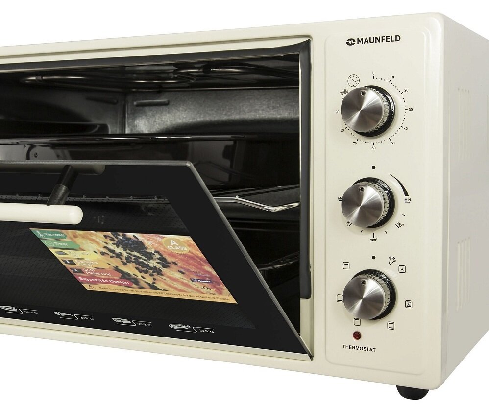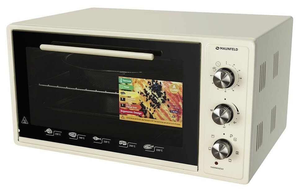 Лучшие цены. Мини-печь MAUNFELD CEMOA.456.I — это компактный кухонный прибор, предназначенный для приготовления различных блюд. Модель выполнена в бежевом цвете, имеет серебристую фурнитуру. Управление механическое, осуществляется при помощи поворотных переключателей. Насчитывает 7 функций, включая гриль. Есть функции автоотключение и освещения. Магазины в вашем городе.