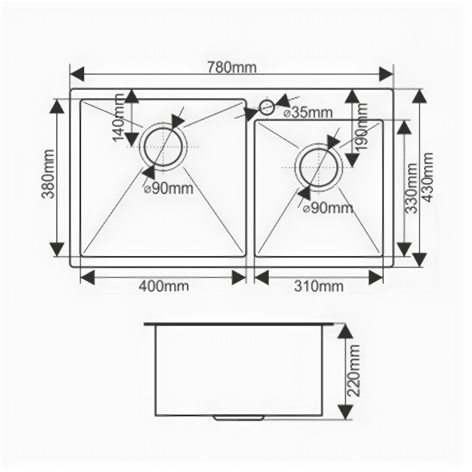 Мойка из нержавеющей стали MELANA S7843HB графит ProfLine 3,0/220, черная, прямоугольная, врезная, две чаши, 78х43см