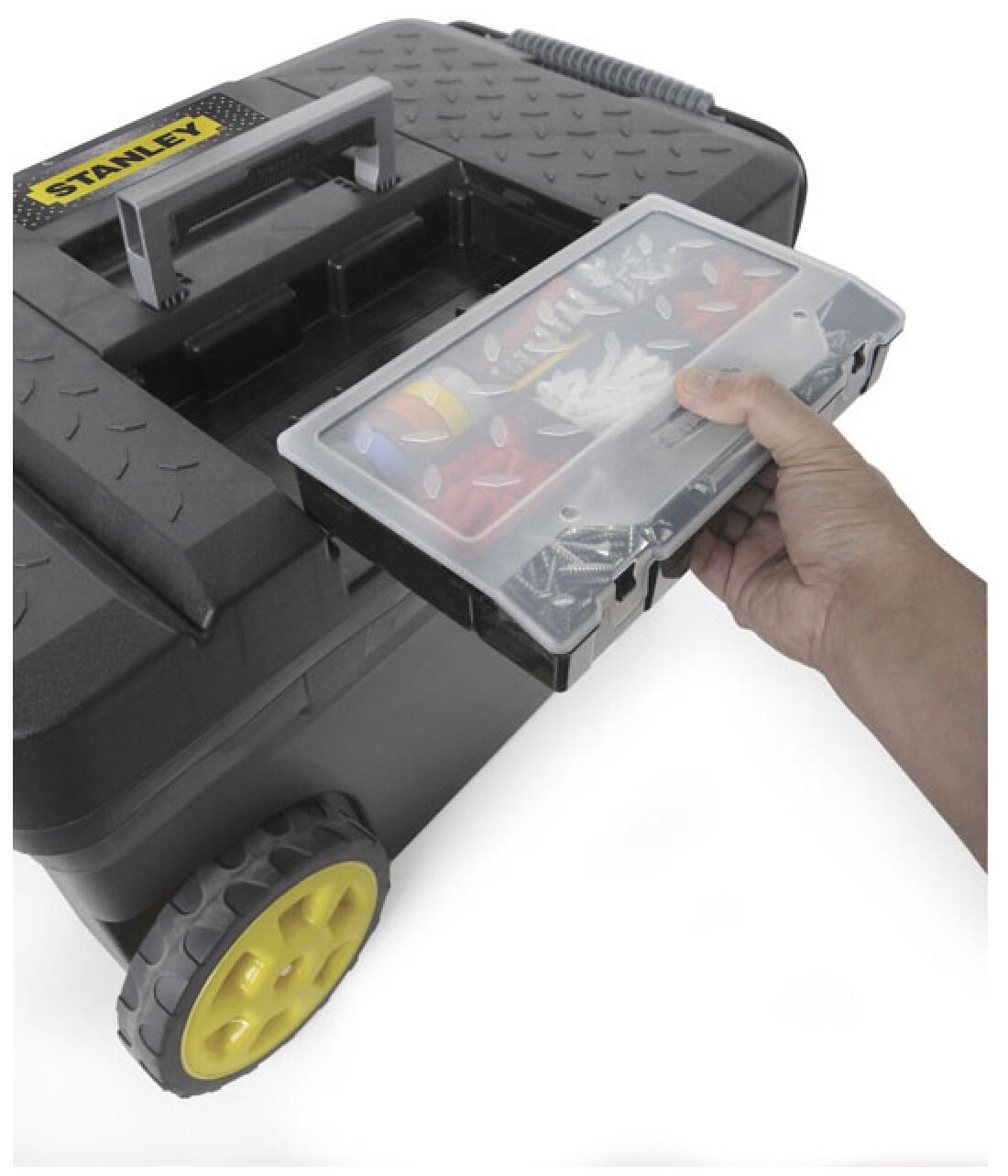 Лучшие цены. Ящик MOBILE CONTRACTOR CHEST Stanley 1-97-503 предназначен для хранения и удобной транспортировки инструментов. Большие металлические защелки надежно защищают ящик от непреднамеренного открывания. Инструментальный ящик применяется как в профессиональной сфере, так и в быту: он очень вместительный, помогает упорядочить нужные в работе предметы и всегда держать их под рукой. Ящик оснащен колесами, съемным органайзером на крышке, телескопической ручкой для легкого перемещения. Магазины в вашем городе.