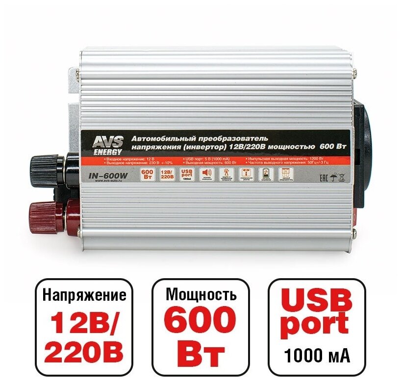 Лучшие цены. Выходная частота 50-60Гц Номинальная мощность 600Вт Допустимая пиковая мощность 1200Вт Размеры: 18 х 14 х 6 см. Магазины в вашем городе.
