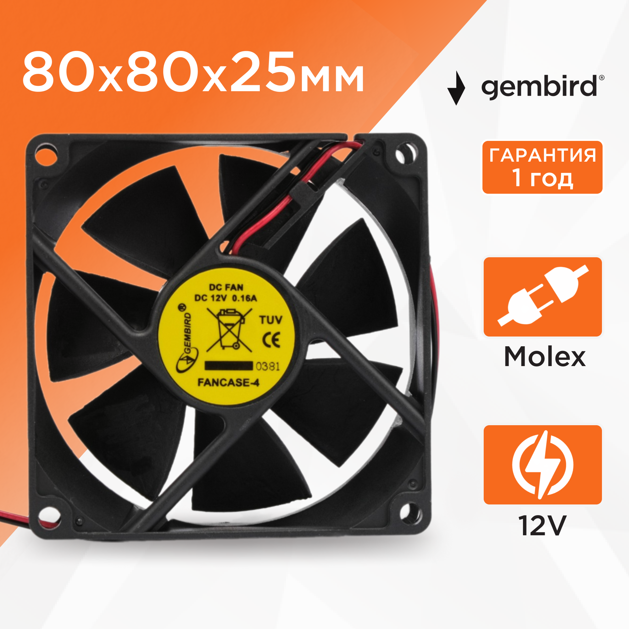 Системы охлаждения Вентилятор охлаждения Gembird FANCASE-4, 80x80x25, втулка, Molex F+Molex M, провод 30 см