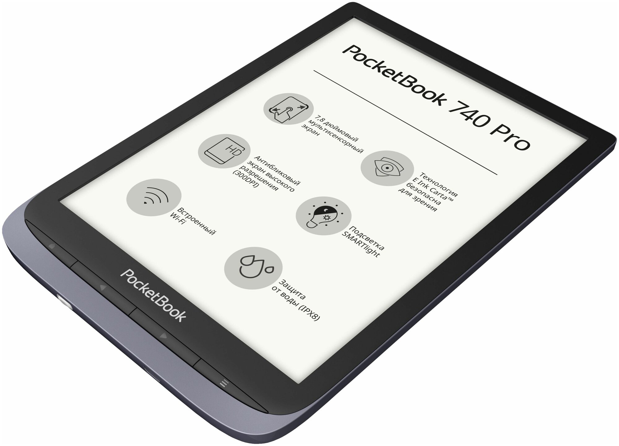 Лучшие цены. Модель защищена от воды, но без полной герметизации. Уровень защиты – IPX8: PocketBook 740 Pro не боится краткосрочных погружений на глубину до двух метров – например, с нее можно читать в ванной или бассейне, и если ридер случайно искупается в воде, то с ним ничего не случится. Брызги жидкостей и пролитые напитки тоже не выведут его из строя. Защита обеспечивается плазменным покрытием. Оно нанесено на плату и на прочие внутренние компоненты устройства. Это позволило сделать ридер защищенным от воды. Магазины в вашем городе.