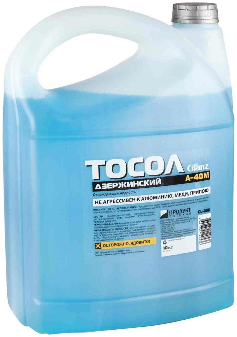 Лучшие цены. Тосол Glanz Дзержинский ОЖ-40 10 кг GL-008 используют для эффективного охлаждения двигательной системы при температуре -40ºС. Состав соответствует всем требованиям ГОСТ. Специальные добавки предотвращают образование ржавчины, пены и различных отложений. Магазины в вашем городе.