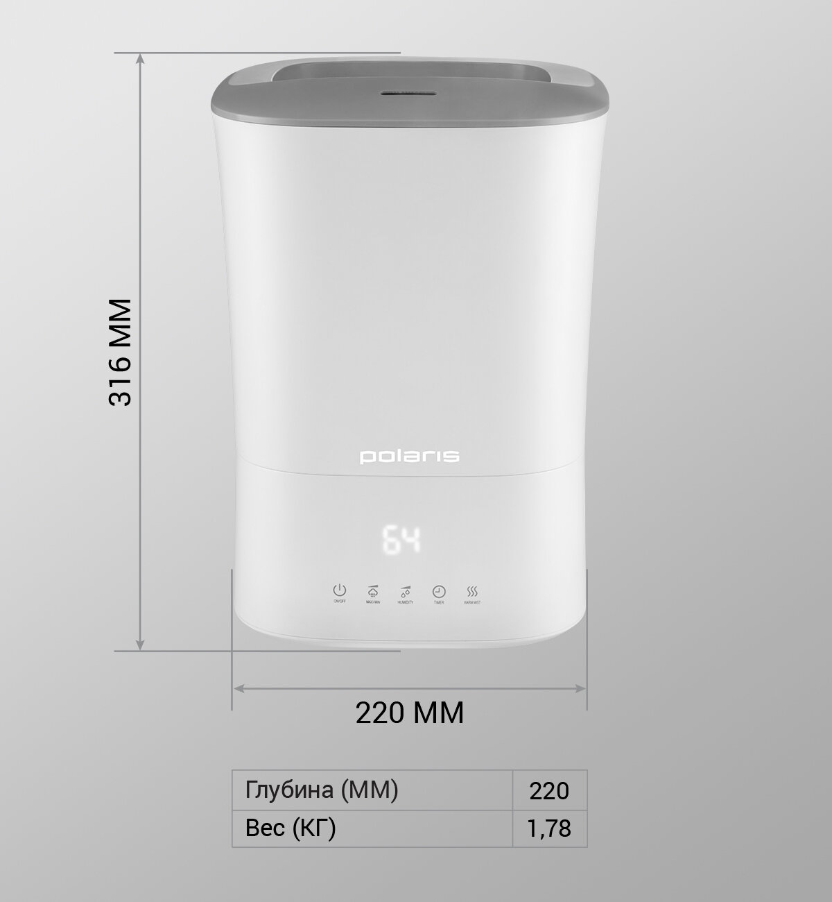 | Функции | гигростатрегулятор влажностиароматизаторночной режим работытеплый партаймер отключенияотключение при отсутствии водыверхний долив водыдисплейподсветка корпуса |