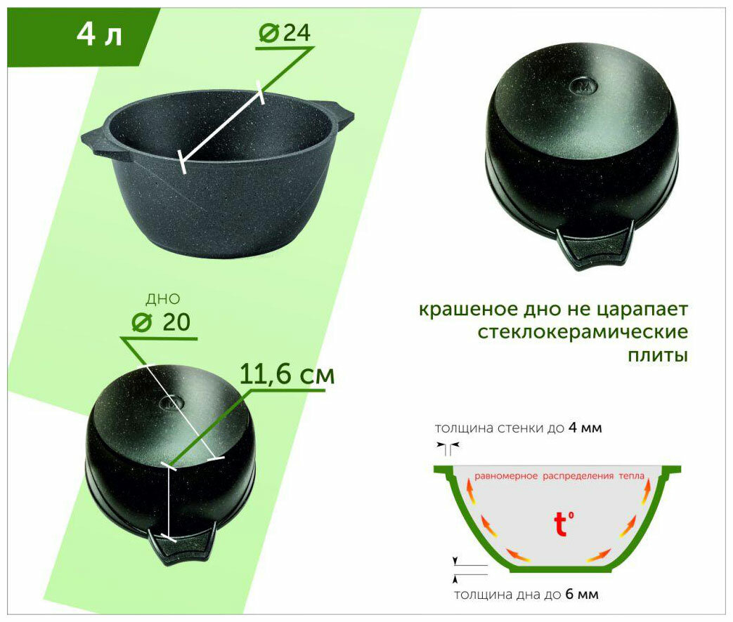 Лучшие цены. Диаметр: 24 см Объем: 4 л Диаметр дна: 20 см Диаметр крышки: 24 см Высота стенки: 116 мм Толщина дна: 5,5-6 мм Толщина стенок: 3,6-4 мм Материал: литой алюминий Цвет: черно-серый Тип плиты: для всех типов, кроме индукционных. Особенности: Все входящие в состав покрытия компоненты прошли жесткую проверку в отношении влияния на здоровье человека и окружающую среду, и поэтому оно является экологичным и абсолютно безопасным. Магазины в вашем городе.