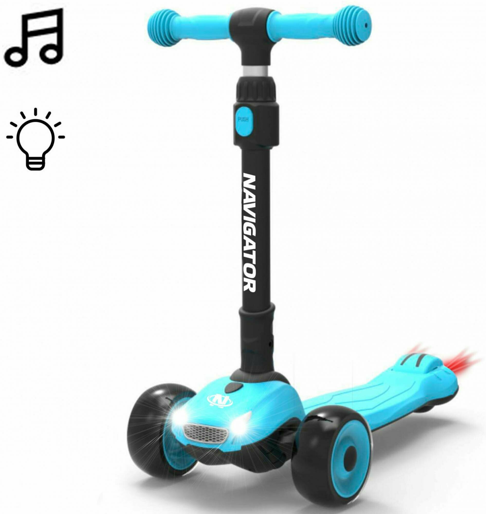 Самокат Navigator упр.накл. PU светящ. кол.2х120*50мм/80мм,алюм.рег.складн.руль,нейлон/пластик,ручки TPR,передн. и задн.фары,музыка,55*13*79(64)см,гол