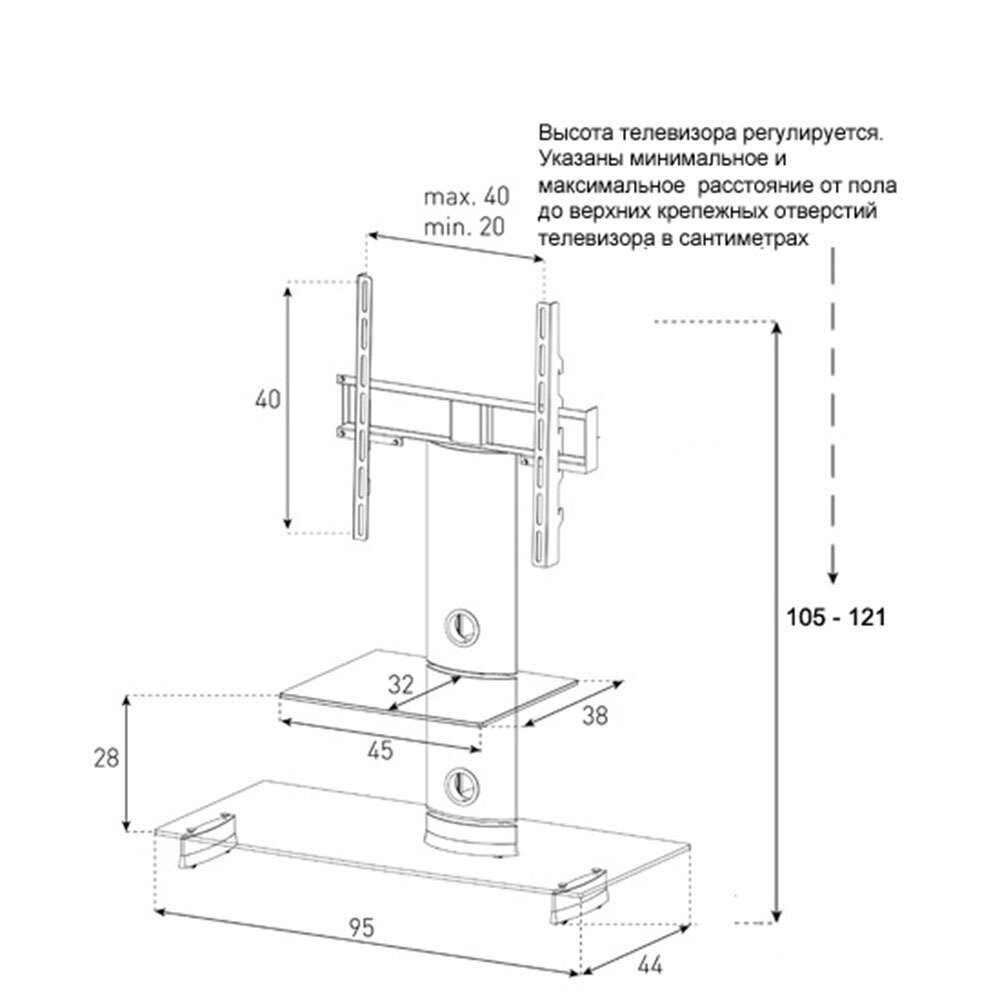 Лучшие цены. Основные характеристики Тип: стойка Назначение: телевизор Минимальная диагональ телевизора: 32" Максимальная диагональ телевизора: 55" VESA: 200x200, 300x300, 400x400 Общее количество полок: 2 Регулировка стойки Угол поворота влево: 35 ° Угол поворота вправо: 35 ° Регулировка высоты: 105-121 см Нагрузка Максимальная нагрузка на кронштейн: 30 кг Нагрузка на верхнюю полку: 10 кг Нагрузка на нижнюю полку: 20 кг Особенности Кабель-канал: да Полированные края полок: да Корпус Цвет корпуса: черный Цвет полок. Магазины в вашем городе.