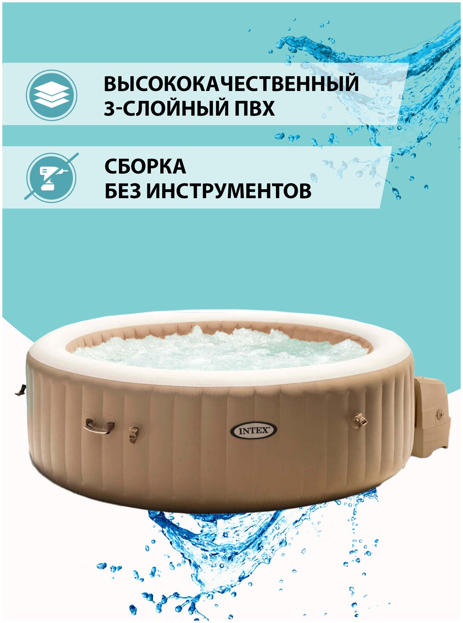 Лучшие цены. Стильный надувной Bubble Massage SPA-бассейн Intex 28426 круглой формы с круговым пузырьковым массажем предназначен для отдыха в кругу семьи или друзей. Модель выполнена приятных оттенках: светло-коричневая внешняя сторона, белая внутренняя отделка. Материал чаши армированный трехслойный высококачественный ПВХ. Одновременно могут принимать водные процедуры до 6 человек. Особенности: аэромассаж производится струями пузырьков. Магазины в вашем городе.