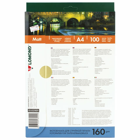 Фотобумага матовая, А4, 160 г/м2, односторонняя, 100 листов, LOMOND, 0102005