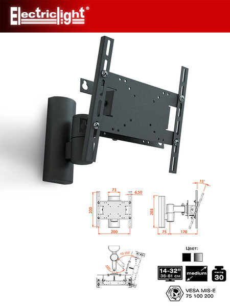 Кронштейн для телевизора на стену наклонно-поворотный с диагональю 14"-32" Electriclight КБ-01-27,металлик