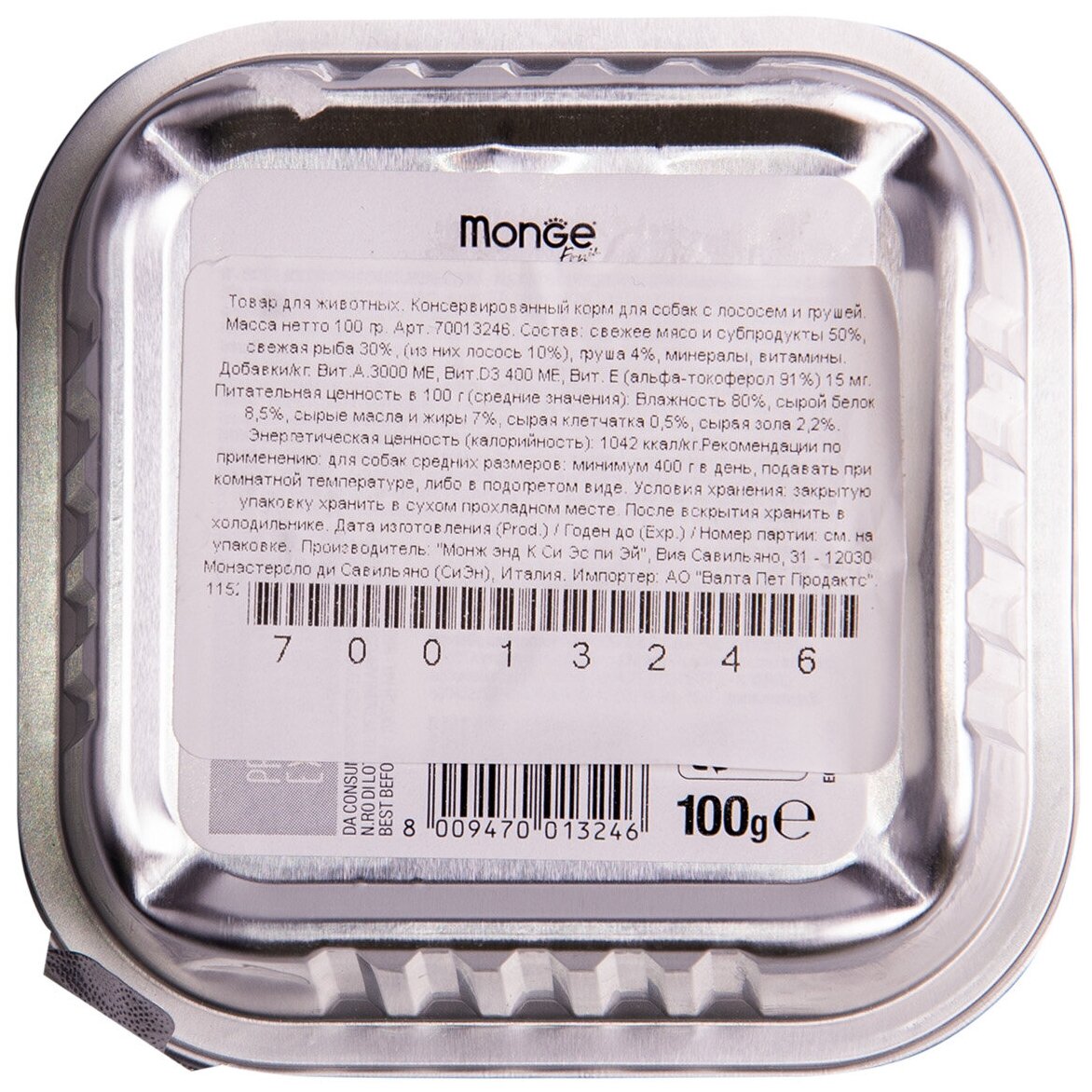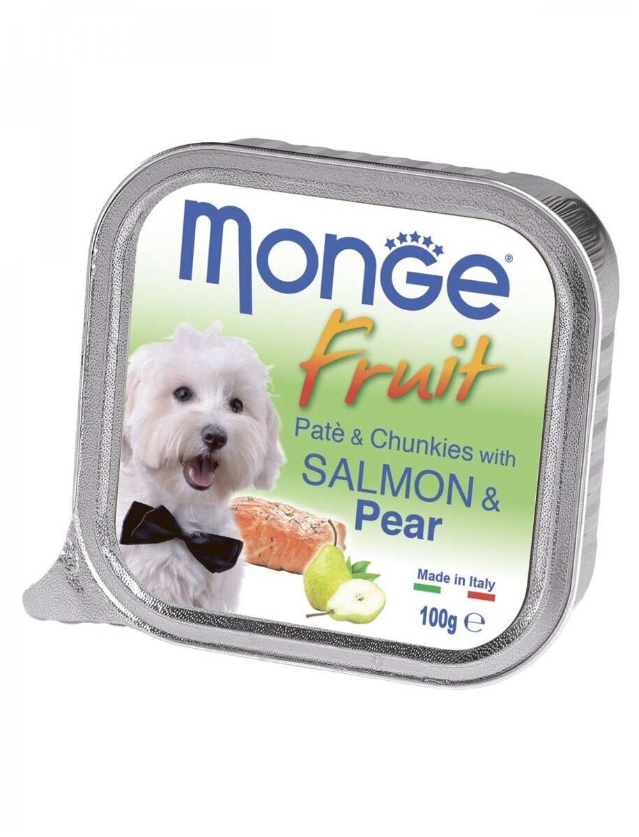 Корм для собак Monge Dog Fruit паштет для взрослых собак всех пород, лосось и груша (32шт в уп) 100 гр