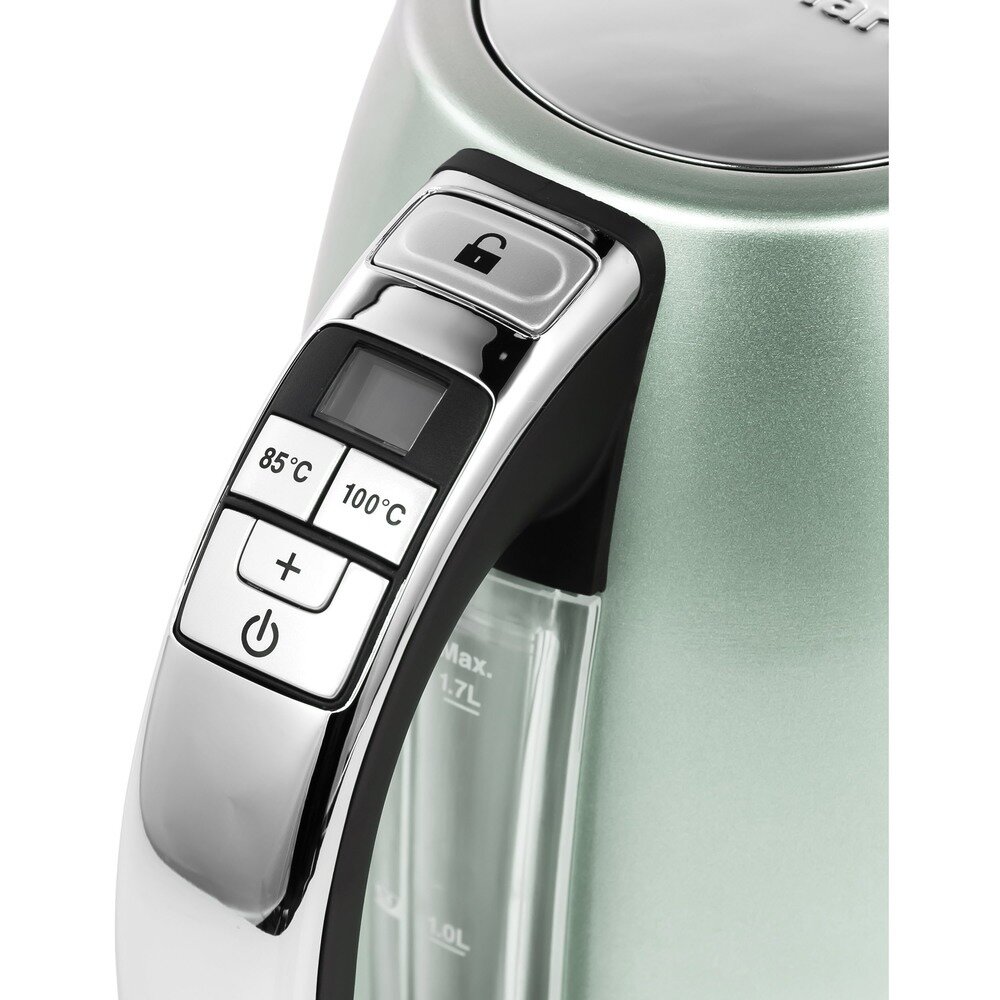 Лучшие цены. Основные характеристики Мощность: 3000 Вт Объем: 1.7 л Материал корпуса: нержавеющая сталь Нагревательный элемент: закрытого типа Цвет: зеленый Управление Управление: кнопочное, электронное Регулировка температуры: есть Дисплей: цифровой Тип дисплея: LED Подсветка дисплея: да Функции Количество режимов нагрева: 4 Минимальная температура нагрева воды: 85 °С Максимальная температура нагрева воды: 100 °С Фильтрация Фильтр от накипи: да Защита и безопасность Автоотключение при снятии с подставки: да. Магазины в вашем городе.