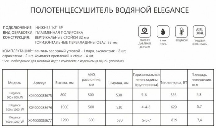 Лучшие цены. Полотенцесушитель Ravak Elegance 500x800 Размеры, мм: 530x800 Межосевое расстояние, мм: 500 Вид установки: подвесной Горизонтальные перекладины (группировка): 5-6 Теплоотдача: 535 Вт Площадь помещения: 4.8 м² Вид подключения: нижнее 1/2" BP Конструкция: вертикальные стойки 32 мм, горизонтальные перекладины овал 38 мм Рабочее давление: до 9 атм Максимальная температура: 110°С Материал: экологическая пищевая нержавеющая сталь AISI 304 L Вид обработки: плазменная полировка Зеркальный блеск изделия: 12 класс. Магазины в вашем городе.