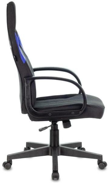Лучшие цены. Тип: Кресло для геймеров; Материал обивки: ткань, искуственная кожа; Цвет обивки: чёрный, синий; Подлокотники: да; Механизм качания: с фиксацией в вертикальном положении; Регулировка по высоте: газлифт; Вращение по горизонтали: да; Основание: крестовина с колёсиками; Ограничение по весу: 120 кг; Дополнительно: Механизм качания с регулировкой под вес и возможностью фиксации в рабочем положении, Регулировка высоты (газлифт). Магазины в вашем городе.