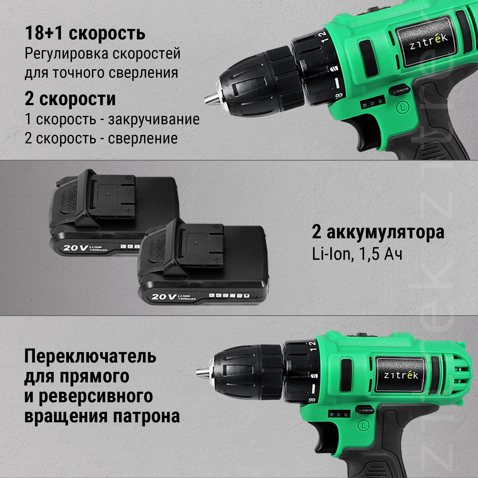 Дрель аккумуляторная Zitrek Greenpower 20-Li (20В Li-ion аккумулятор 2шт ЗУ кейс бита)