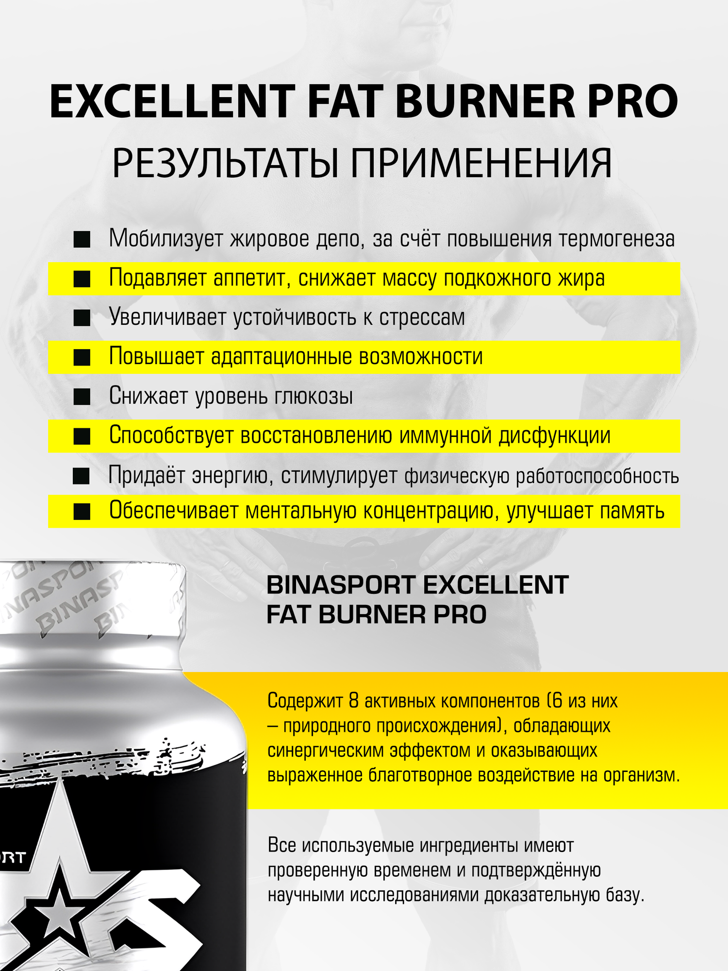 Лучшие цены. Содержит 9 активных компонентов (6 из них –природного происхождения) , обладающих синергическим эффектом и оказывающих выраженное благотворное воздействие на организм человека. Все используемые ингредиенты имеют проверенную временем и подтверждённую научными исследованиями доказательную базу. Результаты применения"BINASPORT EXCELLENT FAT BURNER PRO":Мобилизует жировое депо, за счёт повышения термогенеза, Подавляет аппетит, снижает массу подкожного жира, Увеличивает устойчивость к стрессам и повышает. Магазины в вашем городе.
