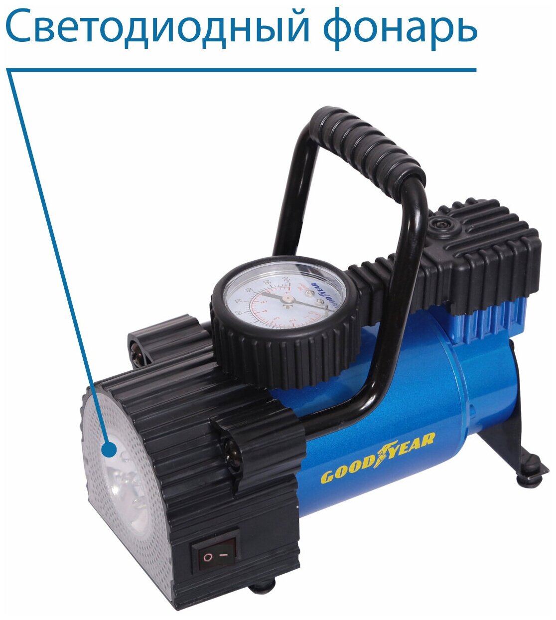 GOODYEAR GY000103 компрессор автомобильный питание - , манометр, С фонарём, со съемной ручкой, 12 V, 7 АТМ, 30 Л/МИН, сумка В комплекте
