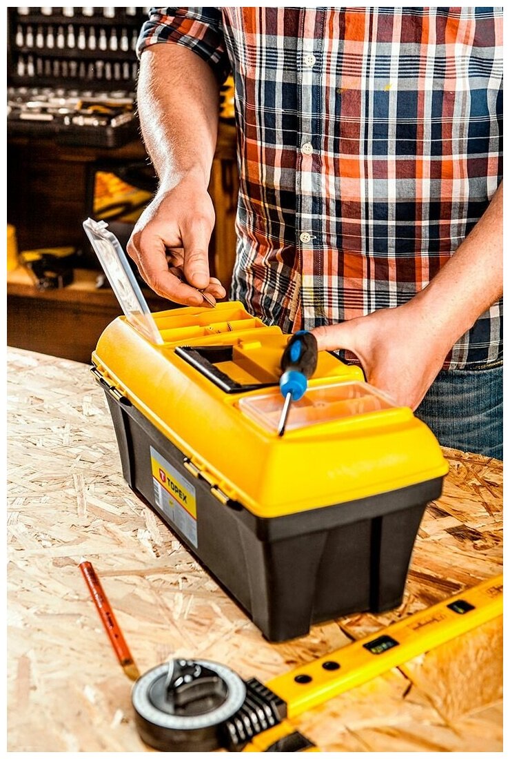 Лучшие цены. TOPEX Ящик для инструмента с органайзерами, пластмассовая рукоятка, пластмассовые защелки 79R124. Bosch Professional: нет. На колесах: нет. Металлическая ручка: нет. Ударопрочный корпус: нет. С выдвижными секциями: нет. С выдвижными полками: нет. С лотками: да. Габариты без упаковки: 380х170х170. Размер: 16.000. Высота: 170.000. Ширина: 170.000. Длина: 380.000. Класс товара: Бытовой. Материал: пластик. Форм-фактор: ящик (кейс). Назначение: для ручного инструмента. Цвет: черный/желтый. Магазины в вашем городе.