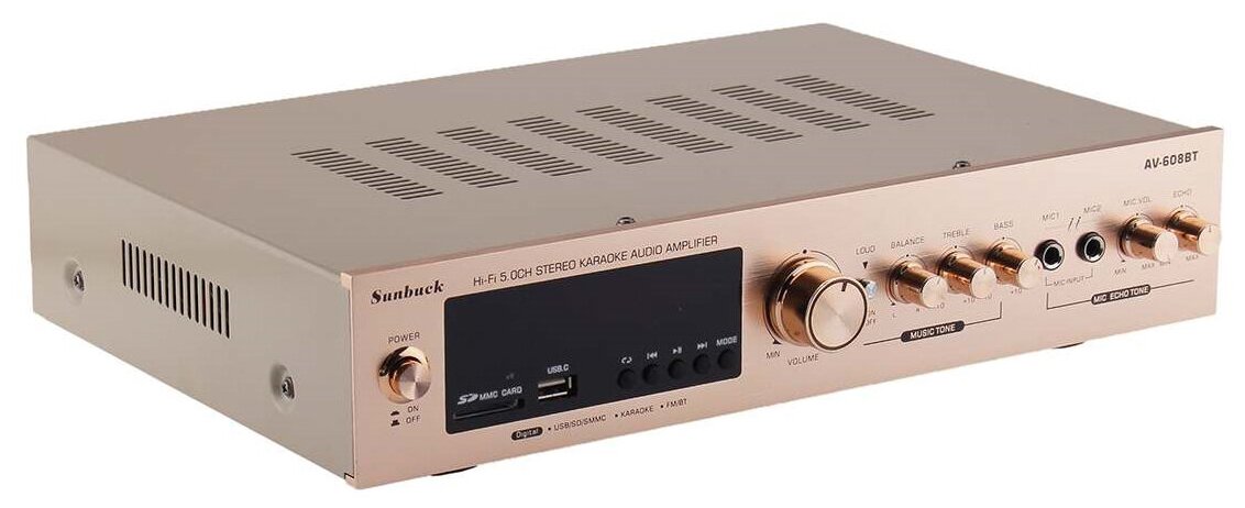 Лучшие цены. Sunbuck AV-608BT – пятиканальный усилитель с мощностью 200В(L)+200В(R)+80В(Sl, SR, C), поддержкой звука Surround, современным модулем Bluetooth 5.0 для стабильного подключения ПК и смартфонов без проводов. Музыку в формате mp3 можно загрузить на флешку или карту SD объемом до 64Гб и воспроизводить аудиофайлы непосредственно с усилителя, устройство также включает встроенный приемник FM радио и функцию караоке с возможностью подключить два микрофона через входы 6.3мм и регулировать эффект Echo и их. Магазины в вашем городе.