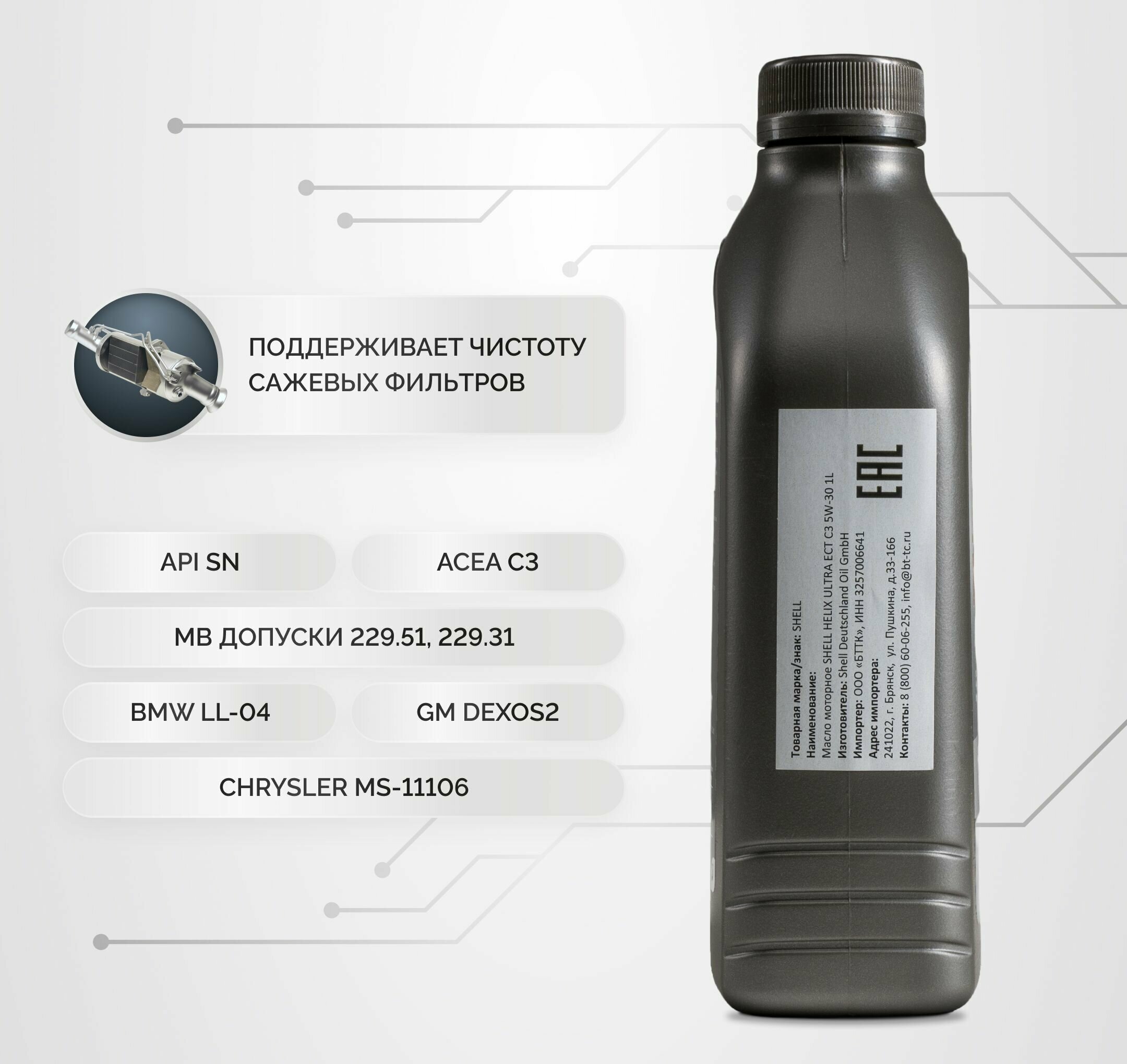 Лучшие цены. Shell Helix Ultra ECT C3 5W-30 это синтетическое моторное масло высшего класса, созданное для высокопроизводительных двигателей. Линейка моторных масел Shell Helix Ultra создана из природного газа с помощью запатентованной технологии Shell PurePlus, которая повышает производительность и увеличивает срок службы двигателя, а также помогает поддерживать чистоту двигателя и сажевых фильтров. Магазины в вашем городе.