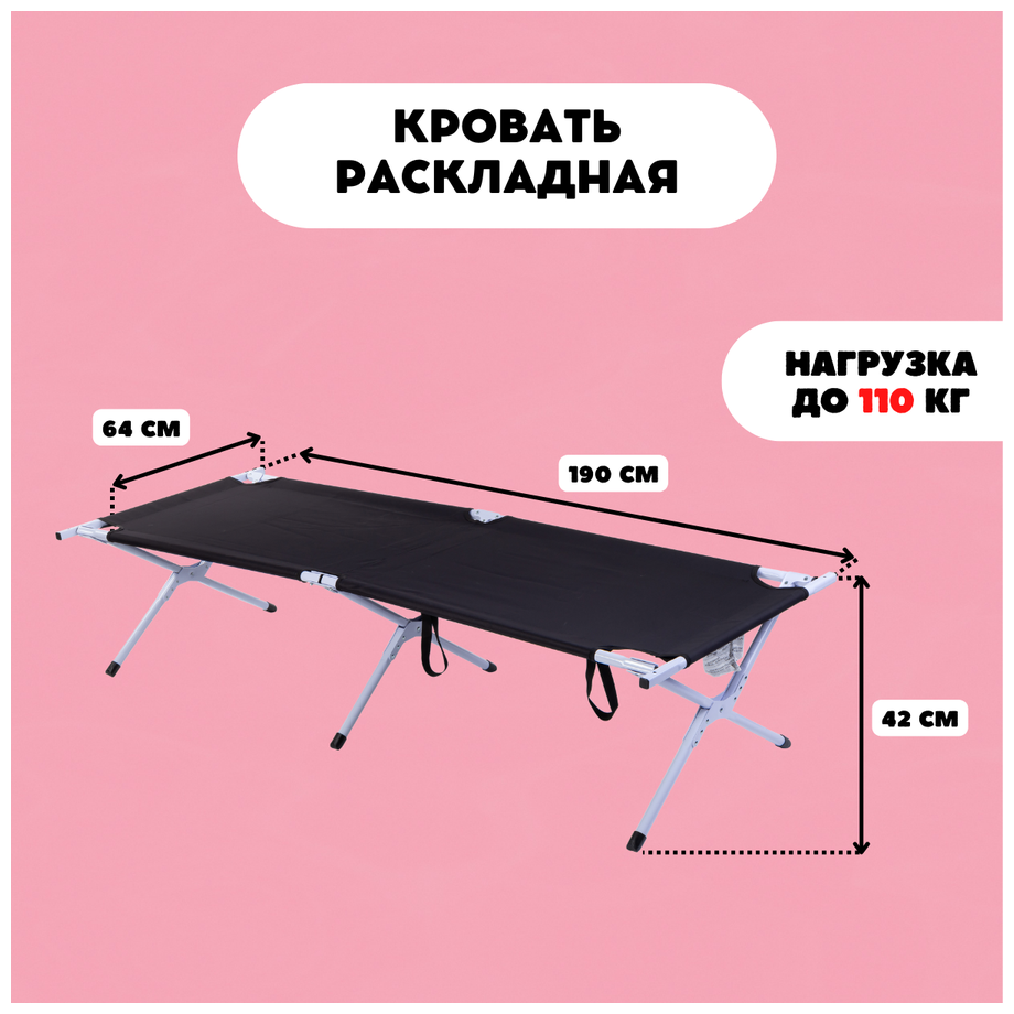 Лучшие цены. Надежная туристическая раскладушка Bestway 190 см. Размер в разложенном виде 190х64х42см (ДхШхВ). Максимальная нагрузка 110кг. Вес без упаковки 6,4кг. Раскладная кровать - это легко складывающийся стальной каркас для компактного хранения. Кровать для кемпинга отлично подходит для ночевок на открытом воздухе. Грузоподъемность: 110 кг (242 фунта). Раскладная кровать размер 190х64х42 см отлично подходит для ночевок на открытом воздухе. Магазины в вашем городе.