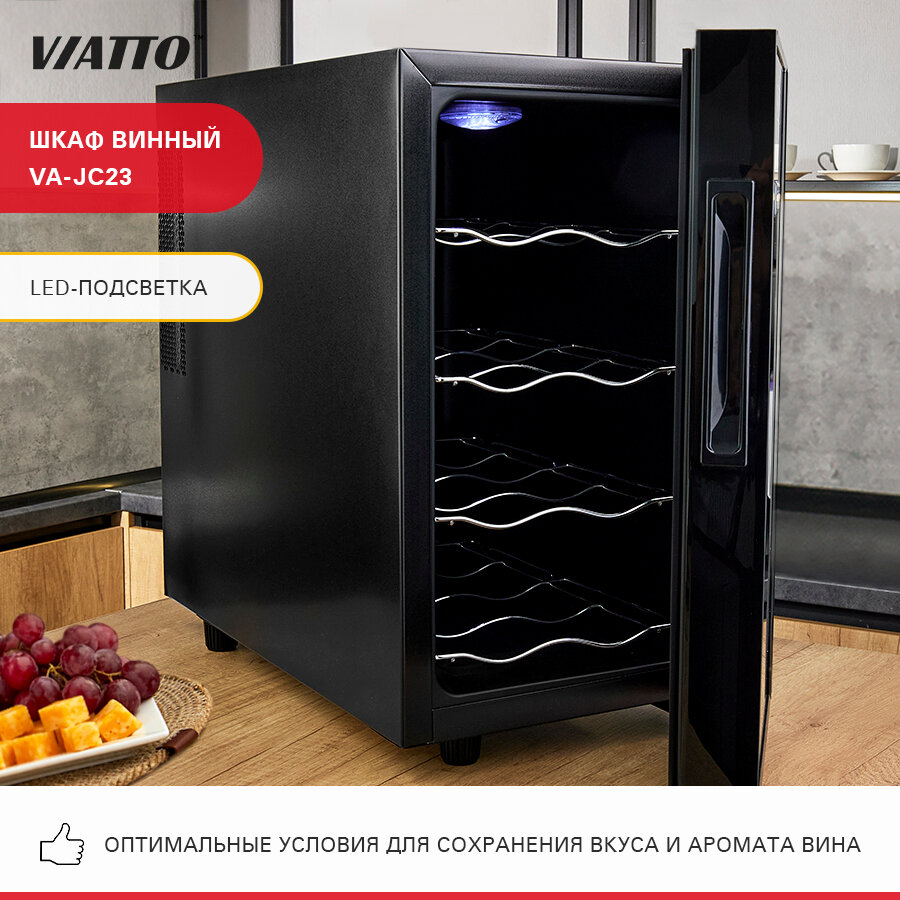 Лучшие цены. Винный шкаф VIATTO VA-JC23 термоэлектрический (без компрессора) поддерживает оптимальные условия для сохранения вкуса и аромата вина. Дверь с тонированным стеклом защищает вино от ультрафиолетовых лучей. Шкаф для бутылок оснащен сенсорной панелью управления с дисплеем. Характеристики: - температурный режим: +8 +18 °C; - 4 хромированные полки; - динамическое охлаждение; - монотемпературный; - 1 стеклянная дверь (тонированное стекло). Магазины в вашем городе.