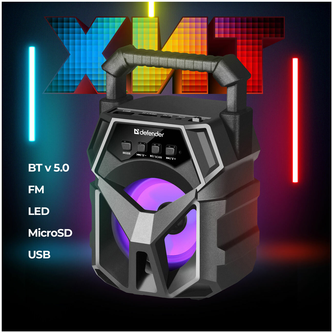 Колонка портативная музыкальная bluetooth, беспроводная с блютуз Defender G98 5Вт, bluetooth, FM радио,USB, MicroSD, AUX, с подсветкой