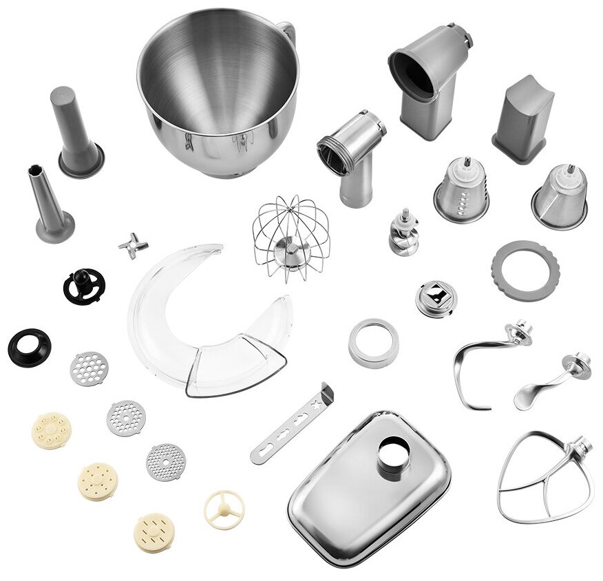 | Аксессуары | венчик для взбивания, двойной крюк для замеса, лопатка для перемешивания (биттер), 3 диска для фарша, насадка для кеббе, насадка для домашних колбас, для печенья, для пасты |
