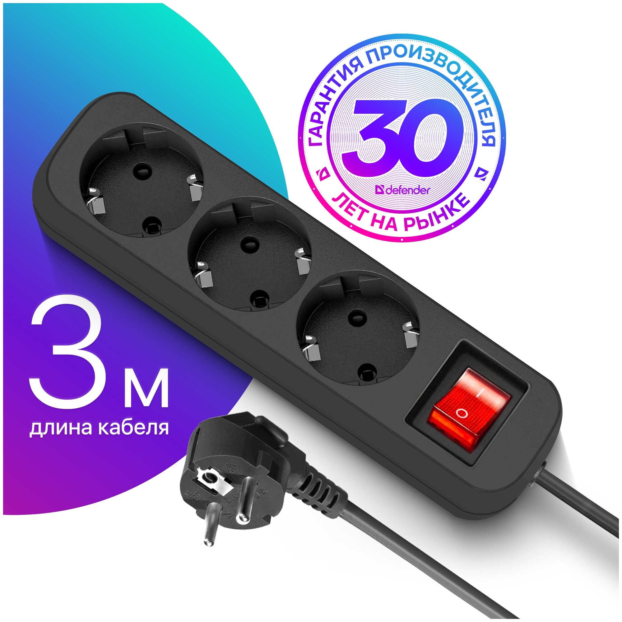 Удлинитель сетевой Defender G330, 3 розетки с заземлением , 3 метра , выключатель , черный