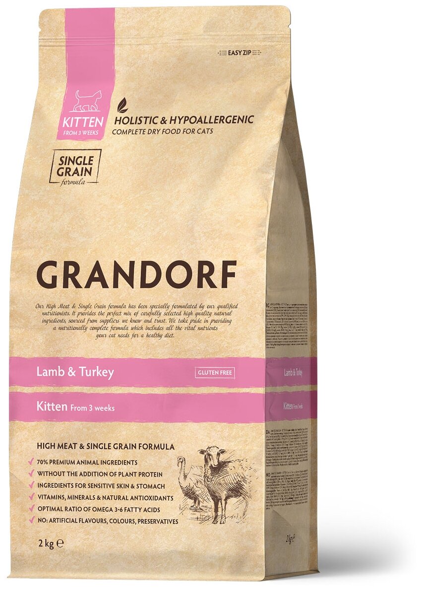 GRANDORF SINGLE GRAIN KITTEN LAMB & TURKEY низкозерновой для котят с ягненком и индейкой (2 кг)