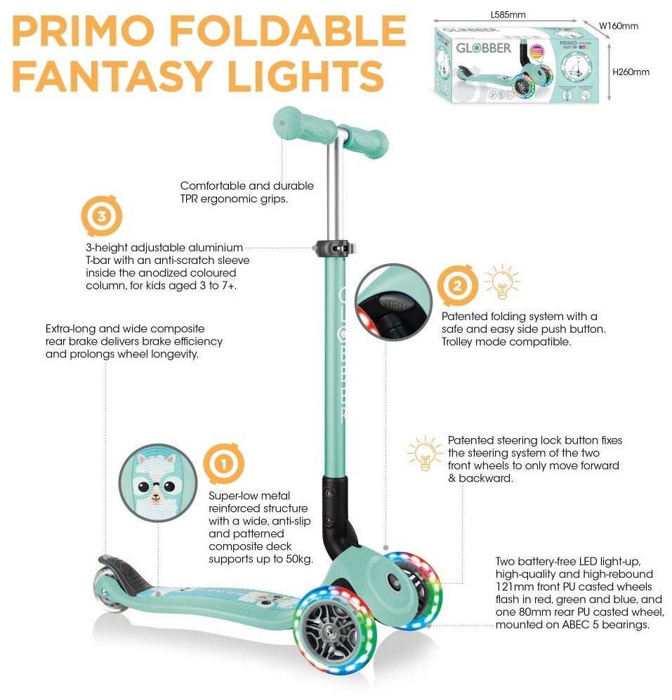 Трехколесный самокат Globber PRIMO FOLDABLE FANTASY LIGHTS мятный