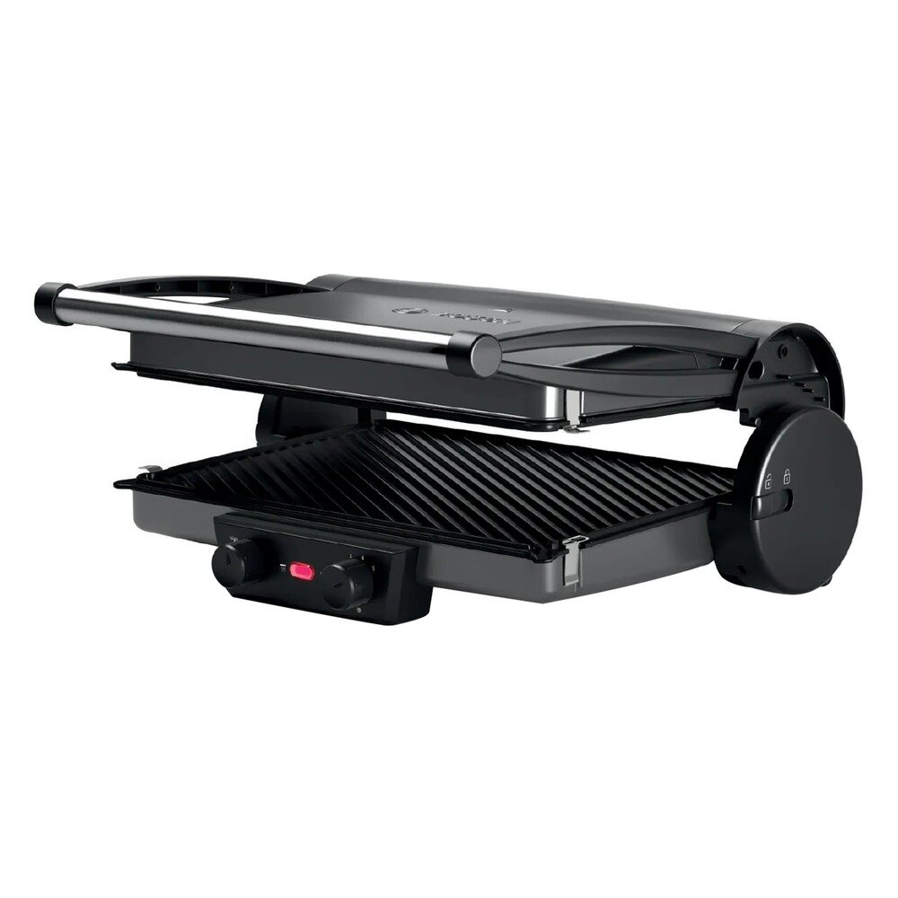 Лучшие цены. Основные характеристики - Мощность: 2000 Вт - Размер рабочей поверхности: 328x238 мм - Вариант использования гриля: закрытый, открытый - Расположение нагревательного элемента: сверху и снизу - Открытие на 180°: да Управление - Управление: механическое, поворотное - Регулировка температуры приготовления: да - Раздельный нагрев рабочих поверхностей: да - Количество температурных режимов: 5 Рабочая поверхность - Материал рабочих поверхностей: алюминий - Антипригарное покрытие: да - Съемные панели: да. Магазины в вашем городе.