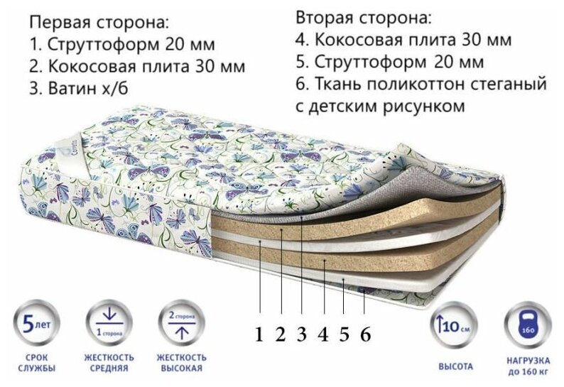 Лучшие цены. Матрас SENZA MOLLE ALTO - является детским, беспружинным матрасом, высотой 10 см. Идеально подходит не только в первые кроватки для малышей, но и в детские кроватки "взрослого размера". В матрасе SENZA MOLLE ALTO чередуются слои кокосового полотна и струттоформа . Матрас является универсальным, потому что стороны матраса обладают разными уровнями жесткости. Его конструкция выполнена следующим образом: одна поверхность обладает высоким уровнем жёсткости, вторая – средним. Магазины в вашем городе.