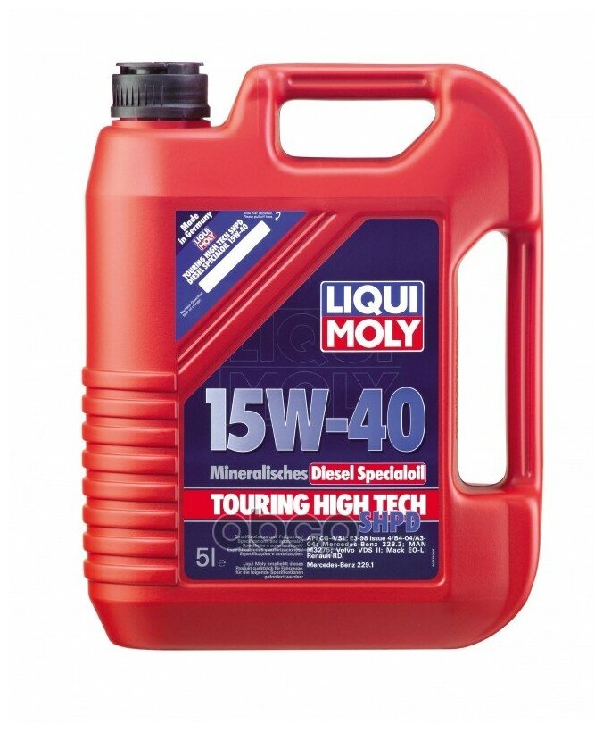 Лучшие цены. Масло моторное 15W-40 TOURING HIGH TECH SHPD 5л LIQUI MOLY 2475 Отвечает требованиям международных классификаций моторных масел как для дизельных, так и для бензиновых двигателей. Отлично подходит для дизельных двигателей тяжелой техники европейских производителей, а также новейших поколений российских грузовиков. Минеральное моторное масло для использования смешанных парках техники, рассчитанной на использование универсальных масел. Масло гарантирует надежную защиту от износа. Магазины в вашем городе.
