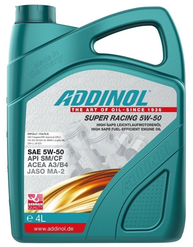 Лучшие цены. ADDINOL Super Racing 5W-50 — это топливосберегающее масло легкого хода класса SAE 5W-50. Великолепные характеристики этого высокомощного моторного масла достигаются благодаря использованию высококачественных базовых масел, изготовленных по самым современным технологиям синтеза, и оптимально подобранных присадок, гарантирующих чистоту двигателя и защиту от коррозии и износа. области применения · Рекомендуется для бензиновых и дизельных двигателей современных легковых автомобилей. Магазины в вашем городе.