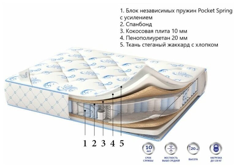 Лучшие цены. Высота 20 см. Уровень жесткости средний. Пенополиуретан 2 см, латексированное кокосовое волокно 1 см, спанбонд, независимый пружинный блок "ТФК" (TFK) 256 пр./кв. м, спанбонд, латексированное кокосовое волокно 1 см, пенополиуретан 2 см. Чехол из хлопкового жаккарда, простеган на синтепоне. Максимальный вес на 1 спальное место 120 кг. Магазины в вашем городе.