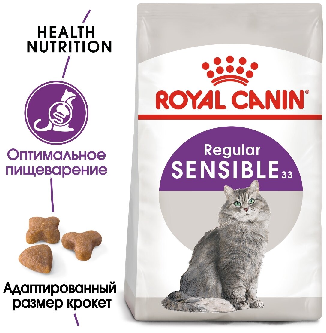 Лучшие цены. Пищеварительная система некоторых кошек чувствительна к определенным типам питания. Если у вашей кошки отмечаются проблемы с пищеварением, то, возможно, потребуется пересмотреть ее рацион. ROYAL CANIN® Sensible 33 разработан для взрослых кошек в возрасте 1–7 лет с чувствительной пищеварительной системой и содержит уникальную комбинацию питательных веществ для обеспечения оптимальной работы пищеварения и пребиотики для поддержания баланса кишечной микрофлоры. Магазины в вашем городе.