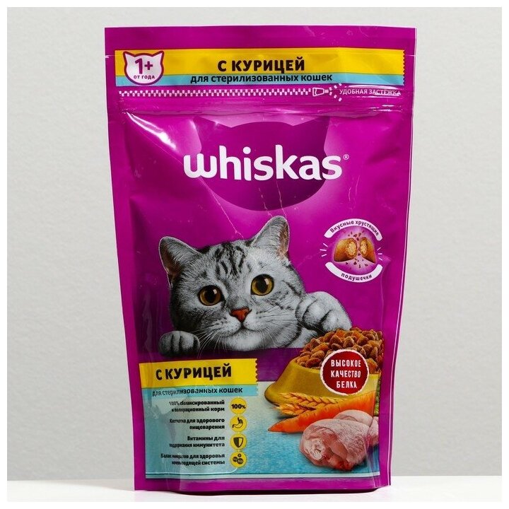 Лучшие цены. Whiskas для стерилизованных кошек создан с учётом особых потребностей питомца. Хрустящие подушечки с нежным паштетом внутри обязательно придутся по вкусу кошке. Кроме того, Whiskas содержит всё необходимое, чтобы рацион кошки был не только вкусным, но и полезным. Оптимальное сочетание питательных веществ и нутриентов помогает поддерживать обмен веществ и здоровье мочевыводящей системы. Витамин Е и цинк укрепляют иммунитет, а в сочетании с омега-6 цинк помогает поддерживать здоровье кожи и шерсти питомца. Магазины в вашем городе.