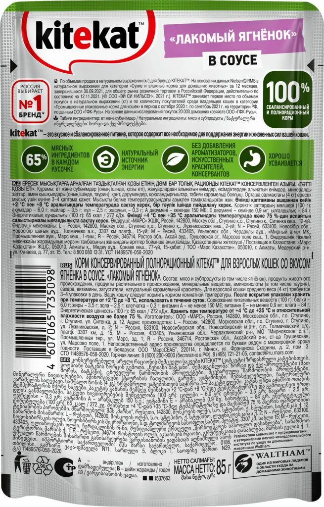 Китекат 10200470/10220176/10226960/10227791/10251340 пауч для кошек Ягненок в соусе 85г