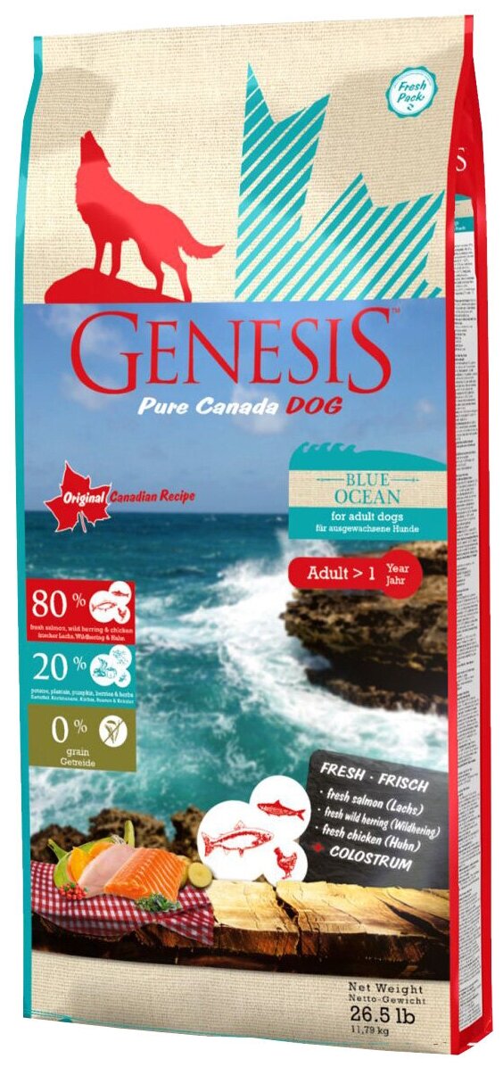 Лучшие цены. GENESIS PURE CANADA BLUE OCEAN ADULT беззерновой для взрослых собак всех пород с лососем, сельдью и курицей. Полнорационный беззерновой корм класса холистик с лососем, сельдью и свежей курицей для взрослых собак всех пород старше 1 года. С начала времен основным компонентом рациона собаки в дикой природе было мясо и рыба, а также разнообразные фрукты, овощи и травы. Сейчас собака, точно также как и его дикий предок - волк, жаждет пищи, богатой мясом. Магазины в вашем городе.