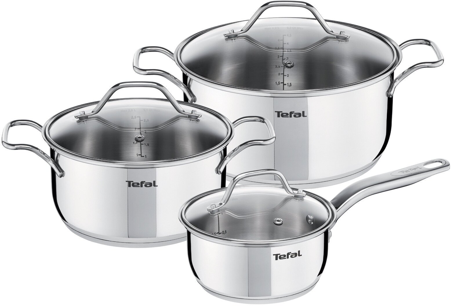 Набор посуды TEFAL INTUITION из нержавеющей стали 6 предметов : Кастрюля 20/24 с крышками, ковш 16 с крышкой Объем 2,9/4,9/1,3л 5 590 ₽ Подробнее