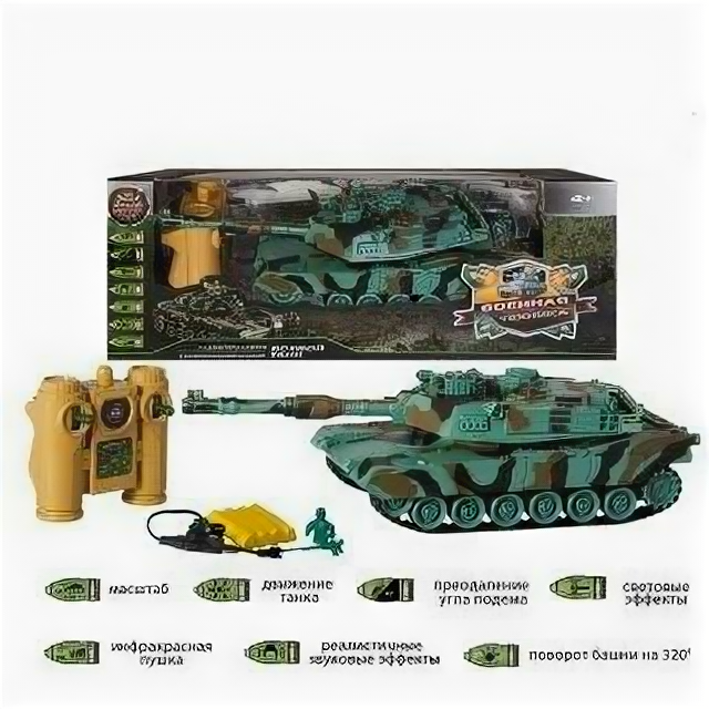 Лучшие цены. Танк с радиоуправлением, реалистичными звуковыми и световыми эффектами при стрельбе и визуальными эффектами (отдача при отстреле). Масштаб 1:32. Движение вперед-назад, вправо-влево, преодолевает подъемы под углом 45°, круговое вращение на месте. Поворот башни вправо-влево на 320°. Одновременно можно включать сразу 2 танка. Радиус действия пульта: 12 метров. Время работы: 15-20 минут. Элементы питания: пульт: АА1,5Vх2 (входят в комплект), машина: аккумулятор NI-CD 3,6V 600 mAh (входят в комплект). Магазины в вашем городе.