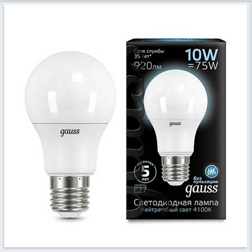 Лучшие цены. Лампа Gauss LED A60 10W E27 4100KХарактеристики: Производитель: Gauss Артикул: 102502210 Цоколь: Е27 Тип лампы: А60 Мощность: 10вт Цветовая температура K: 4100 Световой поток Lm: 920 Аналог лампы накаливания: 75 Индекс цветопередачи: Ra>90 Радиатор: алюминий пластик Рабочее напряжение V: AC180-240 Угол светового потока: 240 Размер: 60х110 Время работы: 35000 Гарантия: 3 года. Магазины в вашем городе.