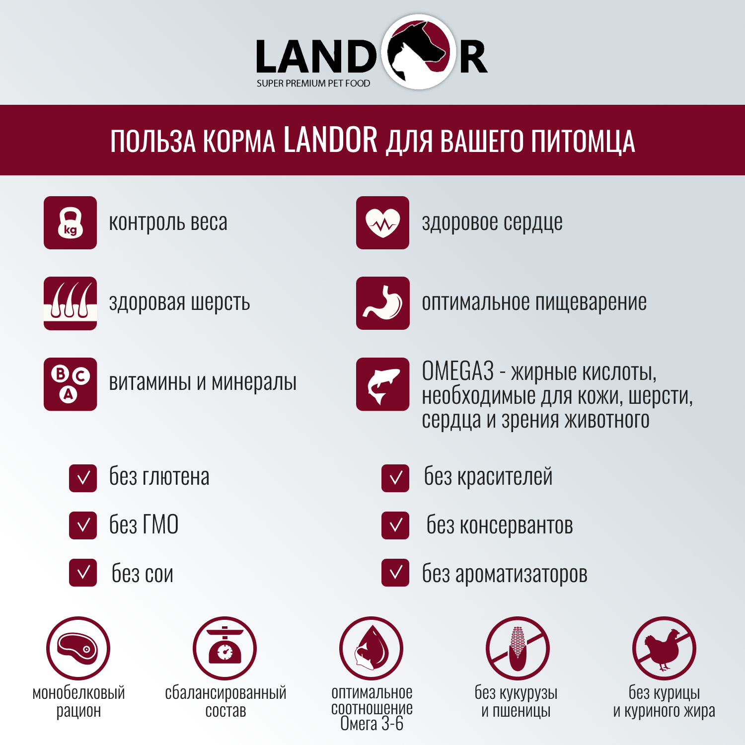 | Назначение | для пищеварения, для кожи и шерсти, для поддержания физ. формы, гипоаллергенный |
