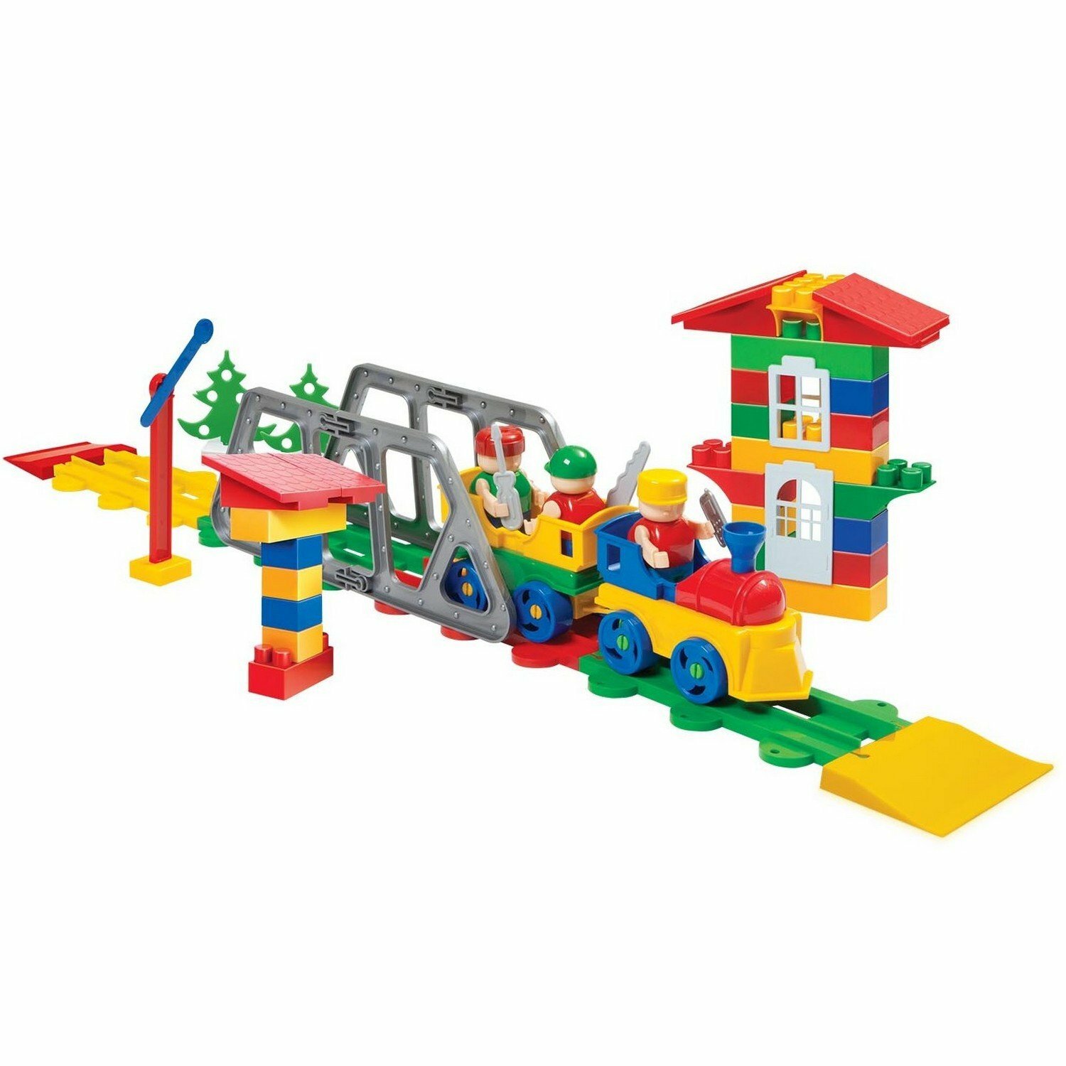 Лучшие цены. Тематический блочный конструктор, посвященный поездам и железным дорогам. Развивает фантазию и мелкую моторику. В комплекте: фигурки человечков, сборные машинки различных конфигураций, сборные поезда и вагоны, элементы дорожного полотна, набор инструментов, набор наклеек “Дорожные знаки”, элементы декора (дорожные знаки, шлагбаумы, деревья, светофоры, забор, окна, двери, крыши, опоры моста), кубики различных размеров. Совместим с другими наборами Bauer. Магазины в вашем городе.