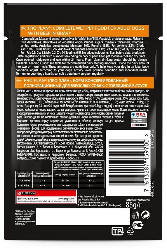 Pro Plan пауч влажный корм для взрослых собак мелких и карликовых пород, с говядиной в соусе,85 г