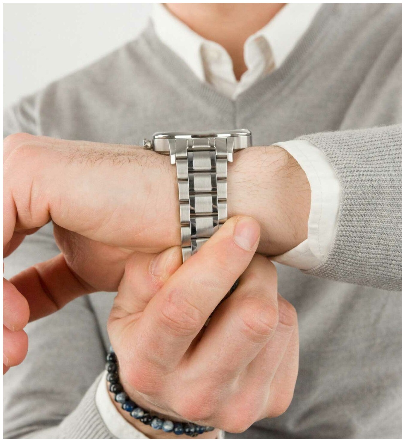 Лучшие цены. Механические часы с автоподзаводом. Водостойкость WR 50. Центральные часовая, минутная и секундная стрелки. Индикация даты. Стрелки и метки с люминесцентным покрытием. Циферблат с часовыми индексами в виде цифр. Корпус выполнен из нержавеющей стали. Диаметр корпуса 45 мм, толщина 11 мм. Устойчивое к возникновению мелких механических повреждений сапфировое стекло. Браслет выполнен из нержавеющей стали. Магазины в вашем городе.