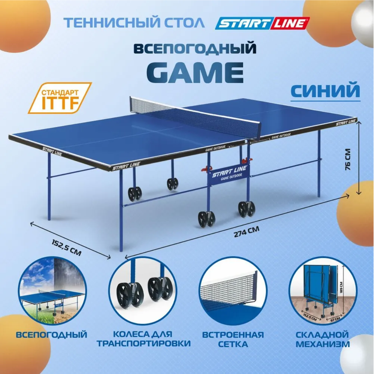 Лучшие цены. Любительский всепогодный стол для использования на открытых площадках и в помещениях Характеристики Start Line Game Outdoor: Цвет: синий, черный. Игровое поле: алюминиевая композитная панель 4 мм. Кант: металлический кант 40 мм с полимерным покрытием. Рама: стальная труба 25 мм с полимерным покрытием. Самоблокирующийся механизм складывания. Транспортировочная система: Двойные транспортировочные ролики диаметром 125 мм, одна сторона маневровая. Сетка: встроенная. Размер (международный стандарт). Магазины в вашем городе.