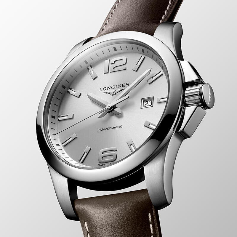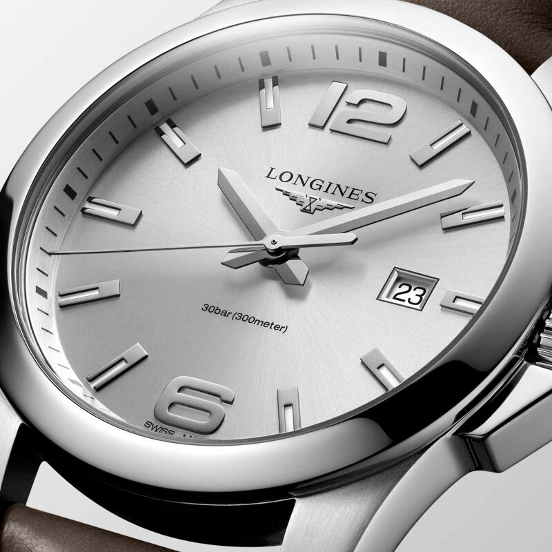 Швейцарские кварцевые часы Longines Conquest Quartz L3.760.4.76.5 на кожанном браслете, с водозащитой 30 бар и международной гарантией от производителя